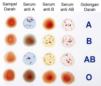 Berikut reaksi tetesan darah terhadap uji antigen yang diteteskan pada tetesan darah tersebut. Umumnya digunakan untuk mengetahui jenis golongan pada manusia.