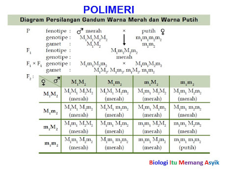 Contoh : Pigmentasi kulit manusia dan Warna biji gandum (percobaan H. Nillson-Ehle) pada biji gandum (persilangan antara gandum berbiji merah gelap dengan putih menghasilkan merah sedang 100%, lalu disilangkan lagi sesama merah sedang)