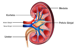 3. Pelvis/Rongga: tempat pengumpulan sementara urine sebelum dilanjutkan. Pada bagian ini kerap tersumbat akibat endapan garam yang kita kenal sebagai batu ginjal.