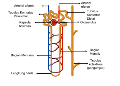 4. Lengkung Henle: Saluran berbentuk U yang bertujuan agar urine dari tubulus kontortus proksimal melaju ke tubulus kontortus distal dan tidak kembali lagi. Terjadi penyerapan kembali (REABSORBSI) air pada lengkung henle ini. Hasil REABSORBSI ini dinamakan urine sekunder.