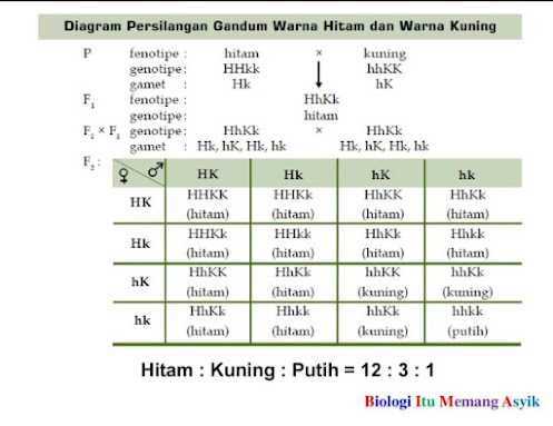 Pada gandum gen H (hitam) epistasis terhadap gen K (kuning). Apabila gen P dan K tidak muncul, maka gandum akan berfenotip putih. bila gandum hitam (HHkk) disilangkan dengan gandum kuning (hhKK), lalu F1-nya disilangkan sesamanya, maka ratio hitam: kuning: putih adalah…