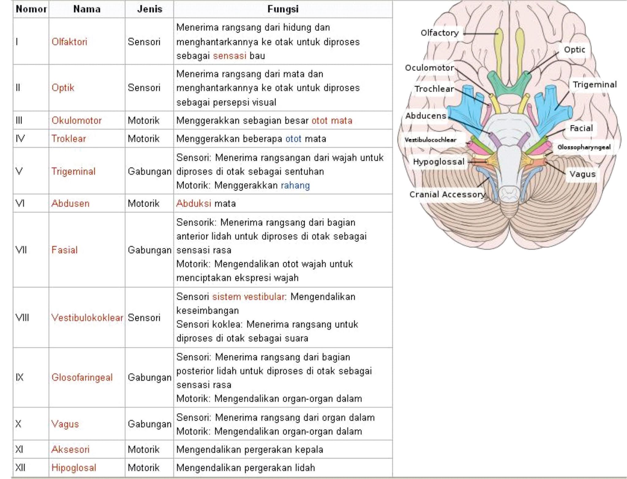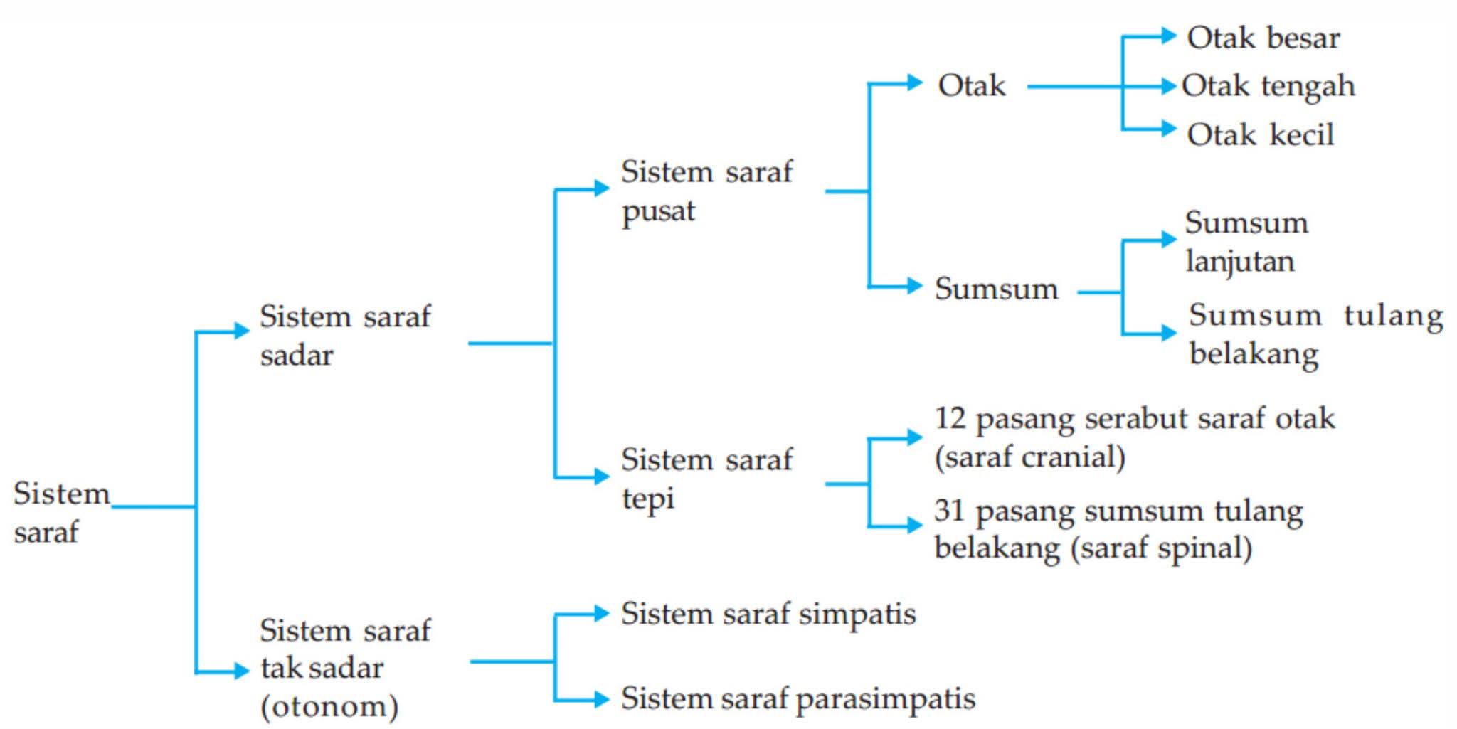 Sistem saraf tepi terdiri dari 12 pasang saraf kranial yang mencuat dari otak dan 31 pasang saraf tulang belakang.