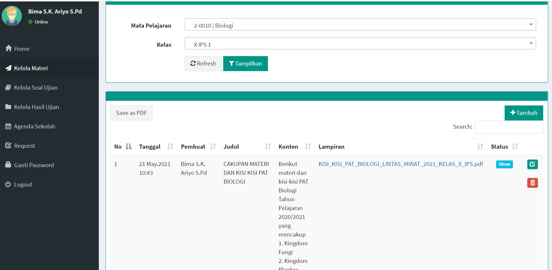 Buka tab kelola materi pada pojok kiri. Kemudian klik tombol tambah di sebelah kanan