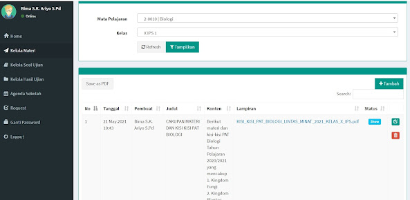 Berikut merupakan cara mengupload materi dan kisi-kisi pada portal CBT online SMAN 8 Tambun Selatan. Diperuntukkan pada guru guru yang membuat soal Penilaian Akhir Tahun Pelajaran 2020/2021.