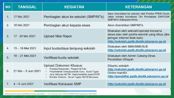 1. 17 Mei 2021: Pembagian akun ke sekolah (SMP/MTs): Akun diserahkan ke sekolah oleh Panitia PPDB Disdik Jabar melalui koordinasi Tim Pendataan DAPODIK SMP/MTs Kabupaten/Kota