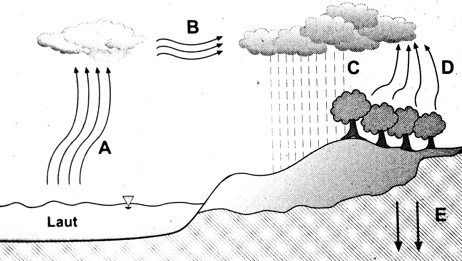 A. Evaporasi: penguapan air laut menuju awan oleh panas matahari