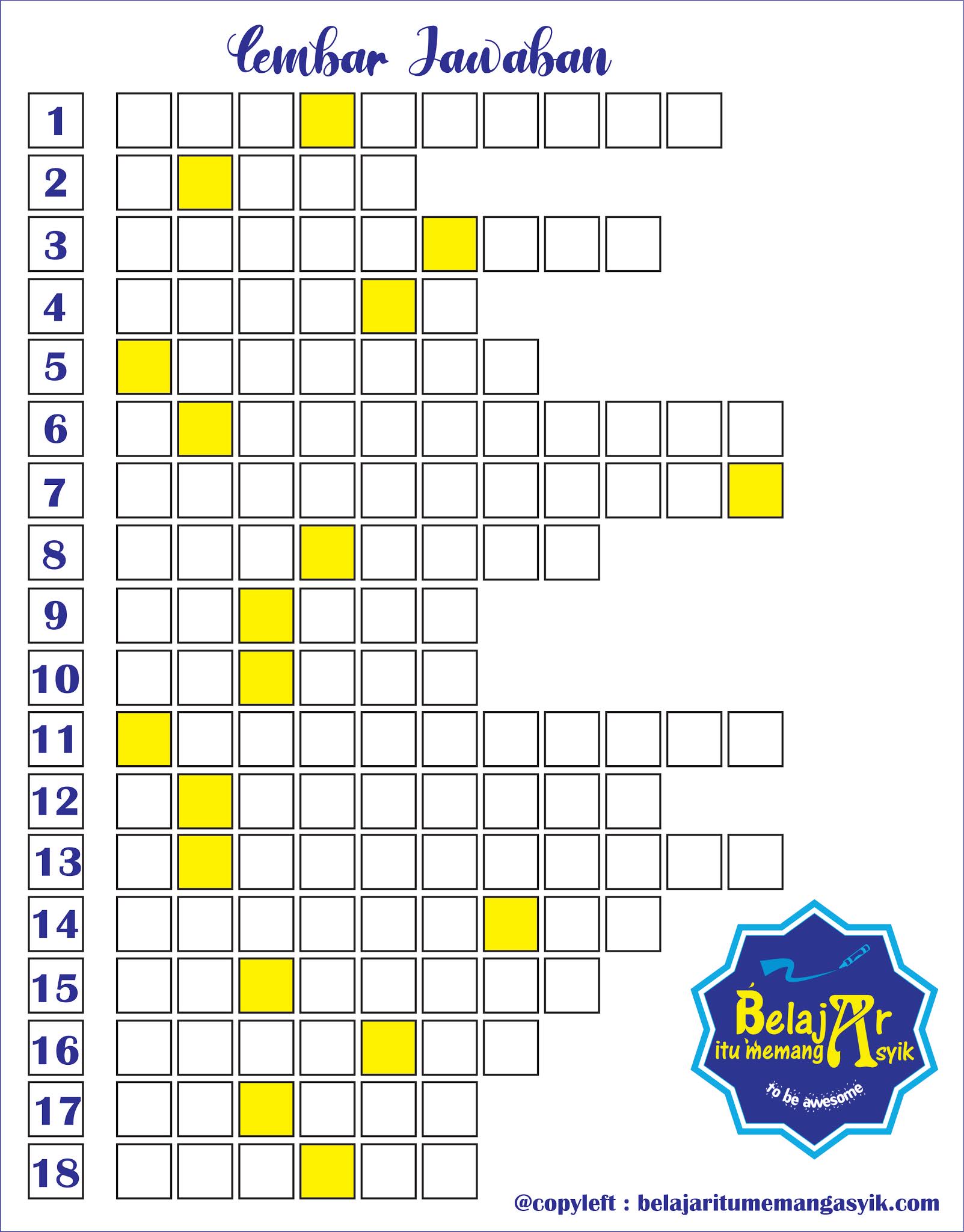 Isikan jawabanmu pada lembar jawaban dibawah ini (satu kotak mewakili satu huruf termasuk kotak yang berwarna kuning)! Isikan sesuai dengan nomor soal!