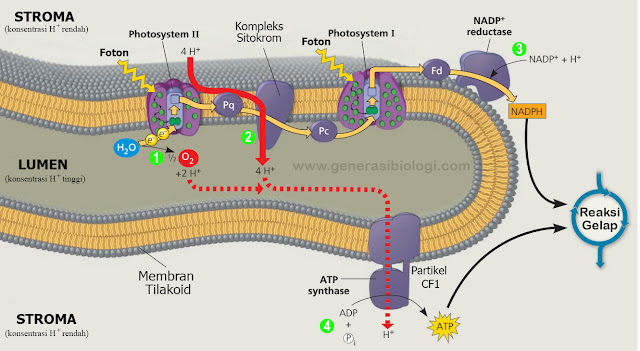 - Tenaga yang berasal dari cahaya matahari mengaktifkan elektron di klorofil sehingga elektron bergerak sepanjang rantai oksidasi yang terdapat di membran tilakoid. Proses pemindahan elektron memompa proton (H+) melewati membran tilakoid.