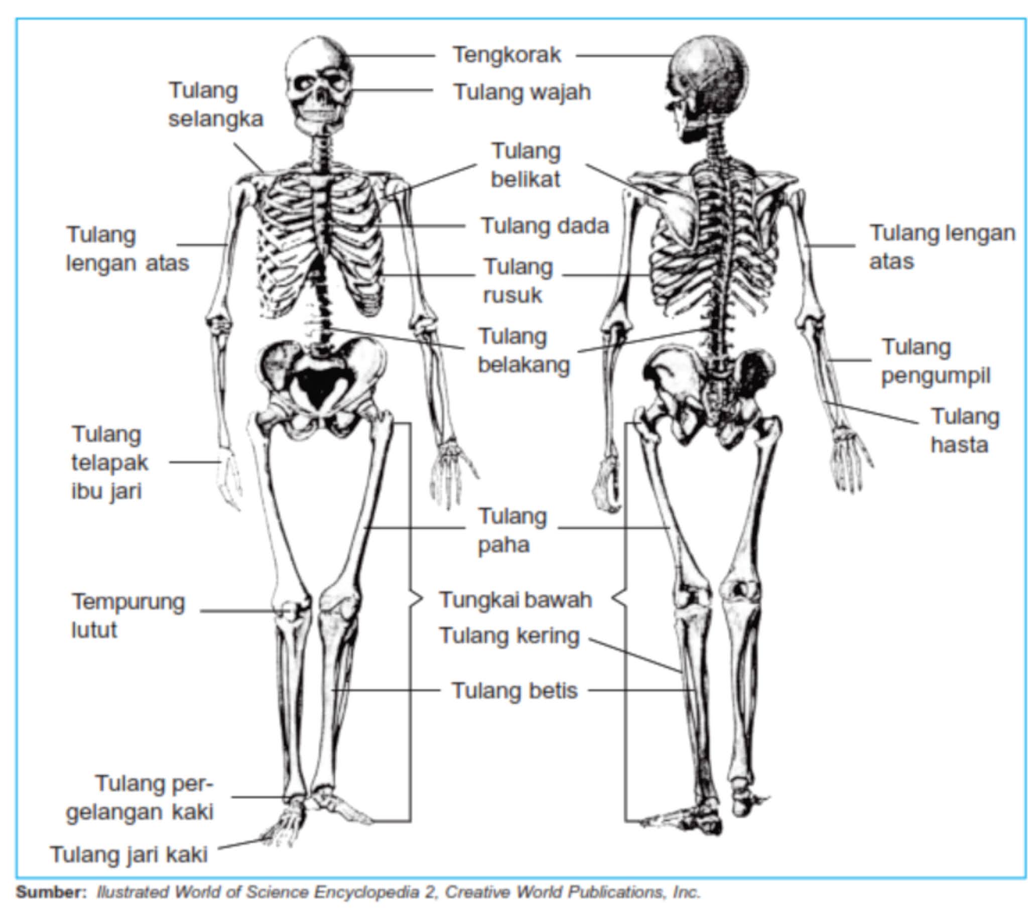 Tubuh manusia terdiri dari 300 tulang saat lahir, kemudian tulang – tulang tersebut menyatu dan saat dewasa berjumlah 206. Berikut rangka-rangka yang kita miliki: