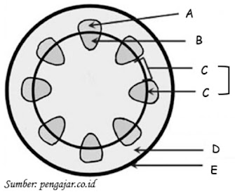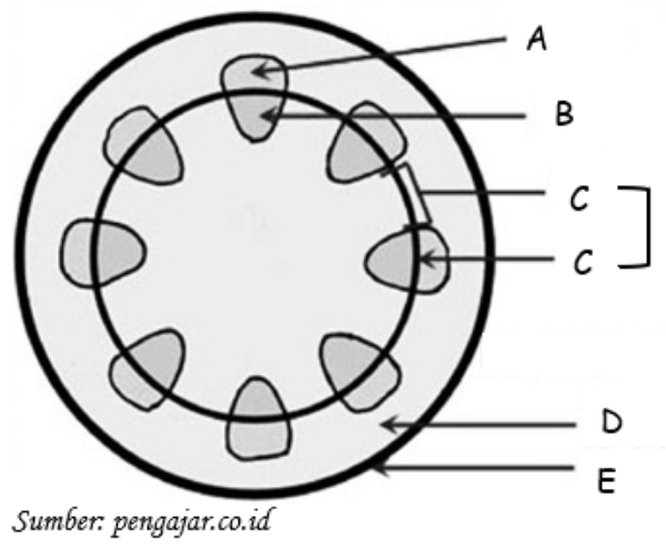 Pembuluh angkut yang bertugas mengangkut air dan hara dari dalam tanah menuju daun ditunjukkan oleh huruf….