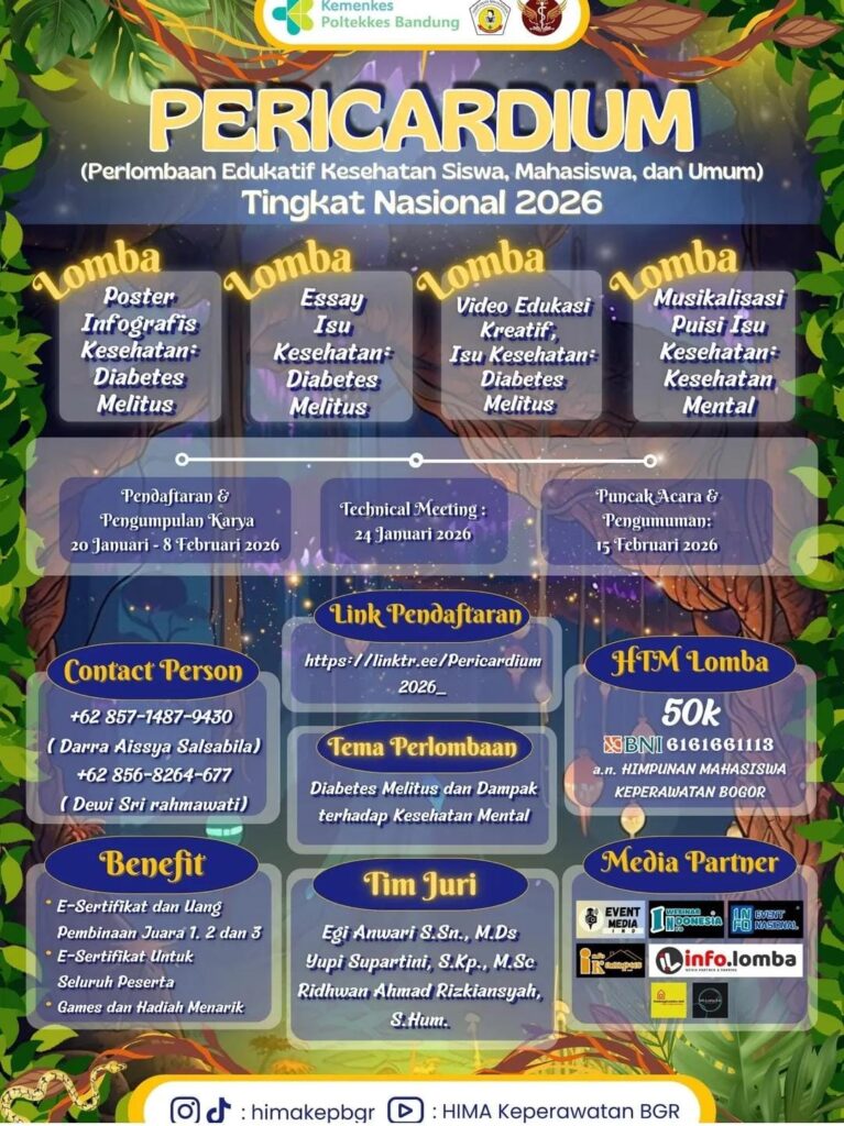 Jika iya, ini saatnya kamu bersinar! Himpunan Mahasiswa Keperawatan Bogor (Poltekkes Kemenkes Bandung) kembali menghadirkan ajang bergengsi tingkat nasional, yaitu PERICARDIUM (Perlombaan Edukatif Kesehatan Siswa, Mahasiswa, dan Umum) 2026.