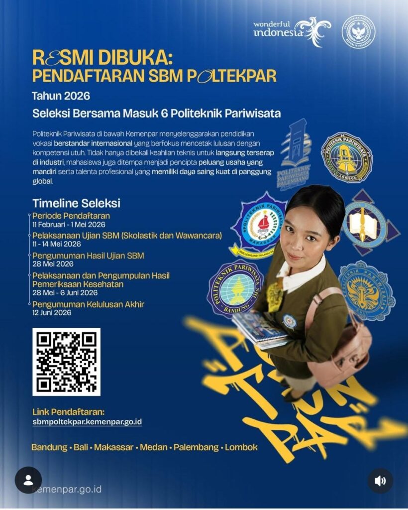 Industri pariwisata Indonesia terus berkembang dan membutuhkan tenaga profesional yang kompeten. Untuk menjawab tantangan tersebut, Kementerian Pariwisata melalui 6 Politeknik Pariwisata (Poltekpar) kembali membuka pintu bagi putra-putri terbaik bangsa melalui jalur SBM POLTEKPAR 2026.+3