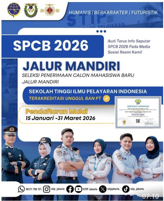 Halo calon pemimpin maritim masa depan! Bagi Anda yang bercita-cita meniti karier profesional di dunia kelautan global, Sekolah Tinggi Ilmu Pelayaran (STIP) Jakarta kembali membuka kesempatan melalui Seleksi Penerimaan Cadet Baru (SPCB) 2026 Jalur Mandiri.