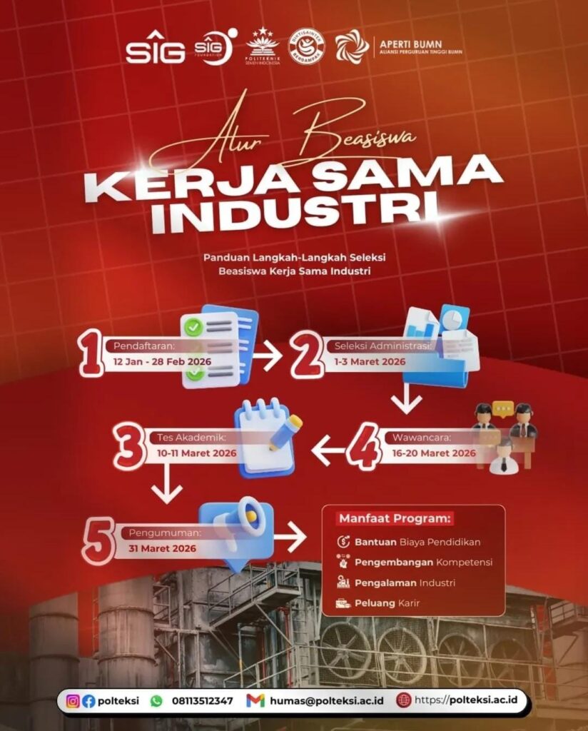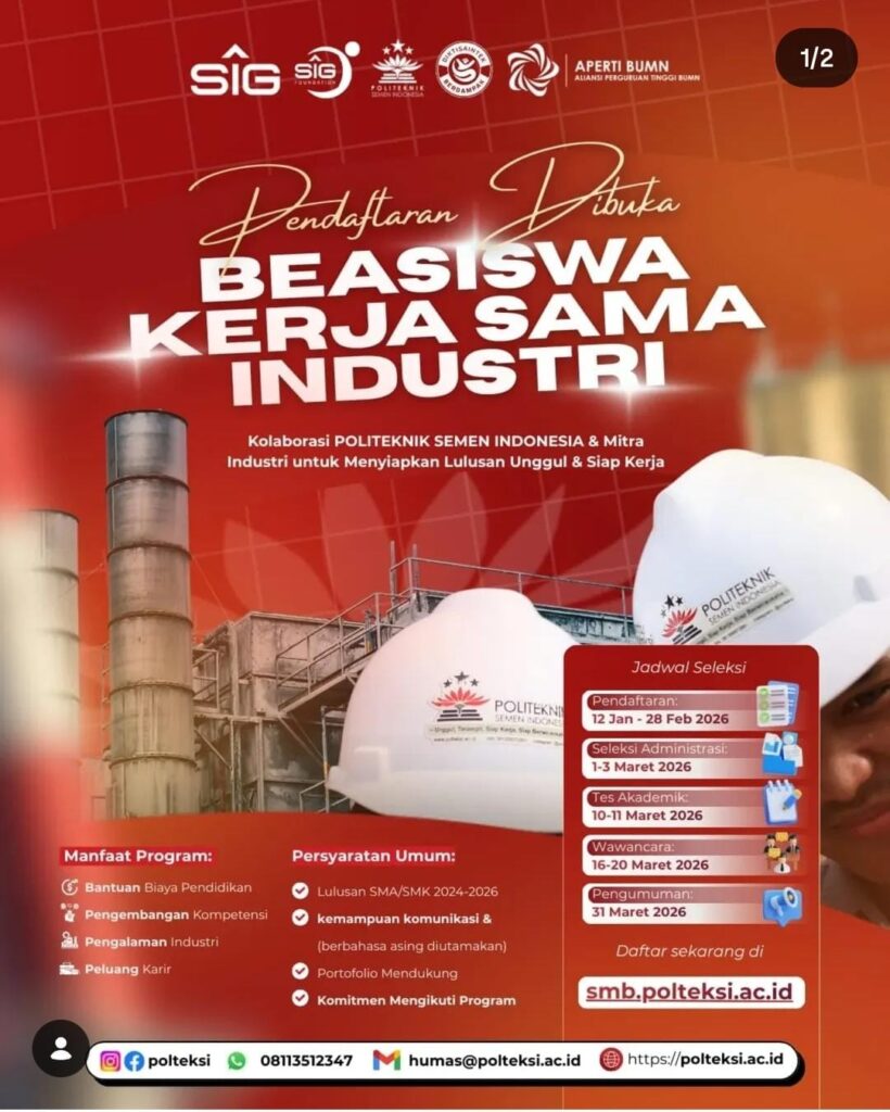 Dunia industri yang terus berkembang menuntut ketersediaan sumber daya manusia yang tidak hanya cerdas secara akademis, tetapi juga siap kerja dan memiliki kompetensi praktis. Menjawab tantangan tersebut, Politeknik Semen Indonesia (POLTEKSI) kembali membuka kesempatan emas melalui Beasiswa Kerja Sama Industri 2026.
