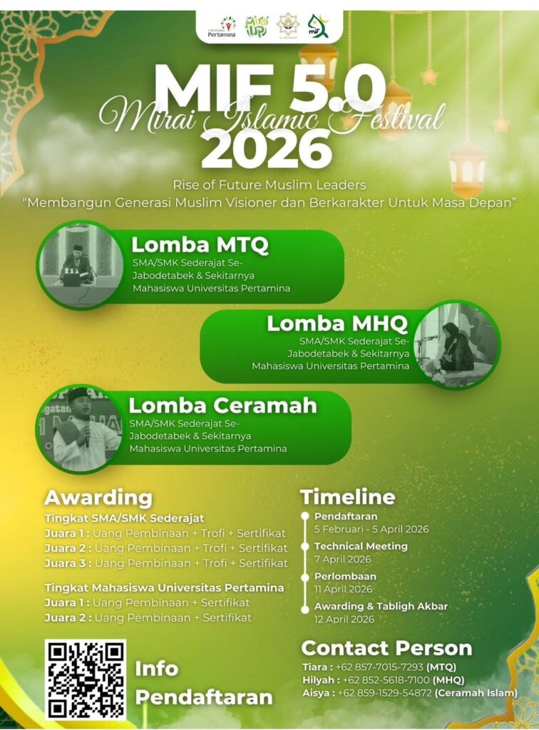 Halo generasi visioner! Kamu tinggal di Jabodetabek dan ingin menguji kemampuan di bidang religi? Mirai Islamic Festival (MIF) 2026 kembali hadir untuk edisi kelima! Dengan tema “Membangun Generasi Muslim Visioner dan Berkarakter Untuk Masa Depan”, ajang ini adalah panggung yang tepat untuk menunjukkan bakatmu.