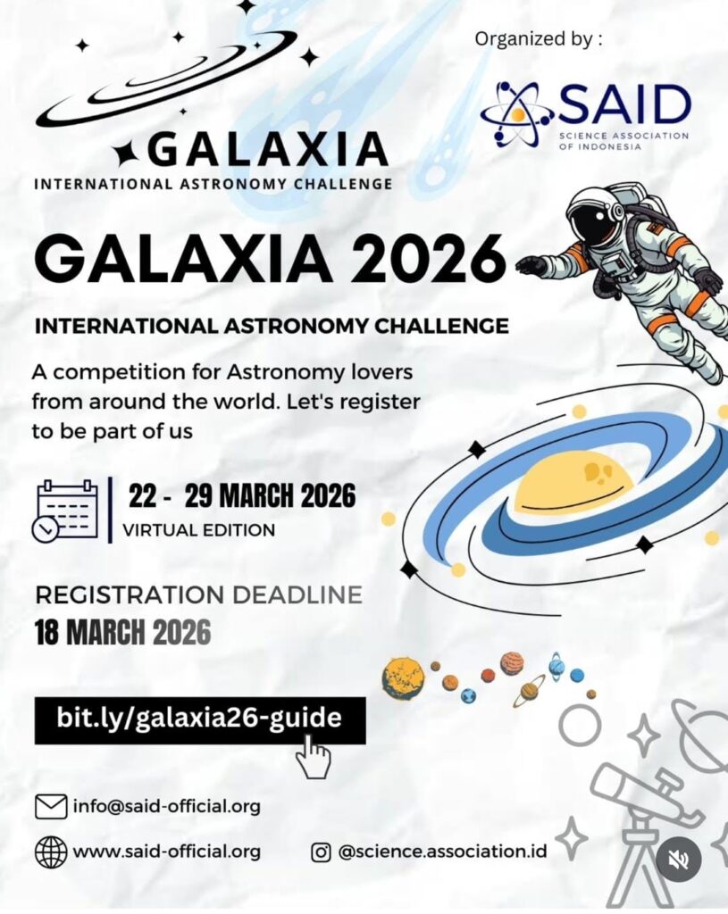 Pernahkah kamu menatap langit malam dan bermimpi untuk menyingkap rahasia galaksi? Inilah saatnya membuktikan kemampuanmu di kancah global! GALAXIA 2026, ajang tantangan astronomi internasional, kembali hadir secara virtual untuk mempertemukan para pencinta astronomi dari seluruh penjuru dunia.