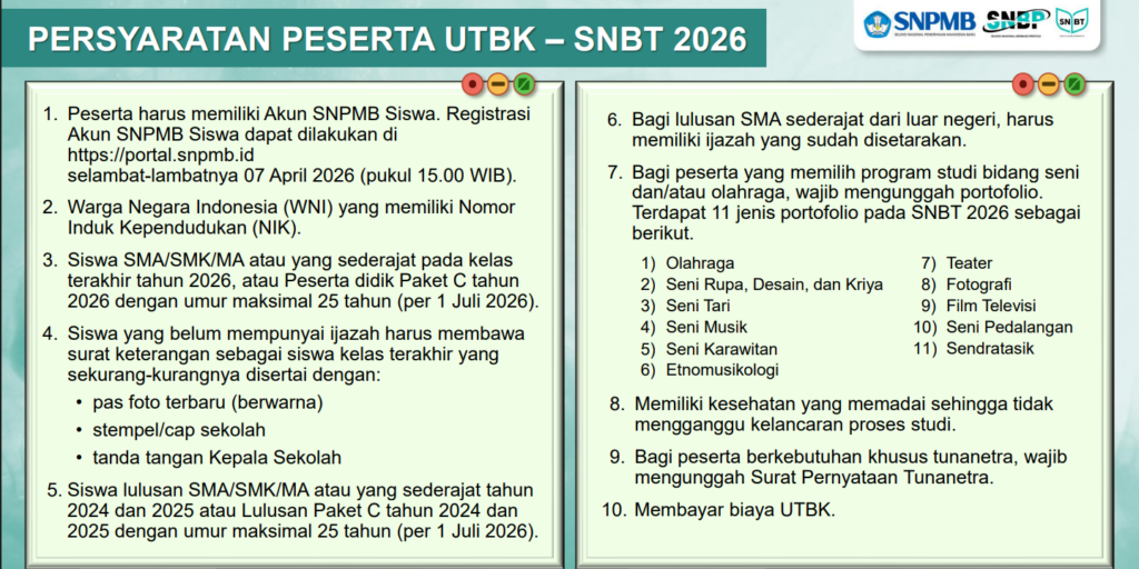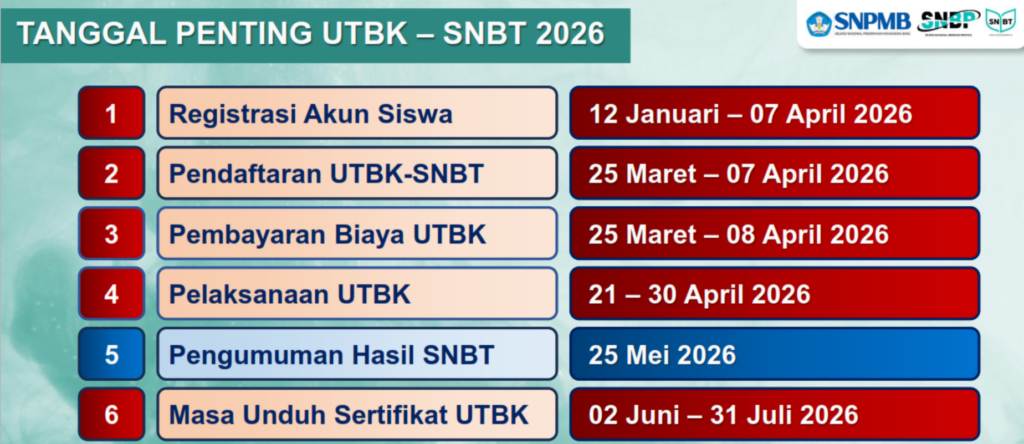 - Proses Pendaftaran UTBK-SNBT dibuka pada 25 Maret hingga 07 April 2026.