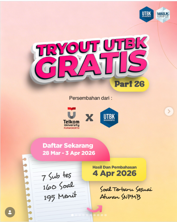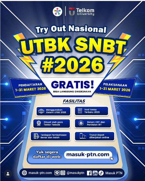 Bagi kamu yang mau lanjut ke Universitas Negeri, Politeknik Negeri, dan Perguruan Tinggi Keagamaan Negeri pastikan di akhir Maret ini kamu sudah bersiap mendaftar UTBK SNBT 2026. Bagi murid kelas XII angkatan 2026 yang non eligible dan angkatan 2024 serta 2025 yang belum berkuliah langsung saja persiapkan diri untuk mendaftar. Untuk yang murid eligible tahun 2026 harap menunggu pengumuman SNBP dulu ya karena kamu bisa ikut UTBK SNBT jika dan hanya jika gagal di SNBP 2026.