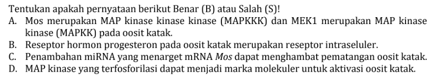 | B | S | Pematangan oosit katak oleh progesteron dipicu via reseptor membran. |