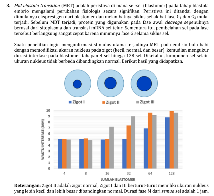 Soal ini membahas tentang konsep Mid Blastula Transition (MBT) dan dinamika pembelahan sel awal (cleavage). Mari kita analisis grafik dan narasi yang diberikan sebelum menentukan benar atau salah.