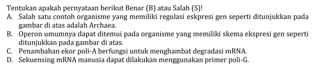 | B | S | Operon adalah ciri Prokariotik, sedangkan gambar adalah Eukariotik. |