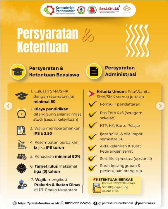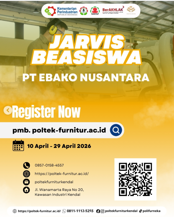 1. Penyelenggara Beasiswa Beasiswa ini merupakan program kerja sama langsung antara PT. Ebako Nusantara (salah satu perusahaan furnitur ternama) dengan Politeknik Industri Furnitur dan Pengolahan Kayu (Polifurneka). Program ini tidak hanya memberikan fasilitas pendidikan secara gratis, tetapi juga sekaligus menawarkan peluang kerja nyata bagi lulusan SMA/SMK melalui proses seleksi dan sistem ikatan kerja (ikatan dinas) setelah lulus nanti. Pendidikan berkualitas dapet, karir pun terjamin!