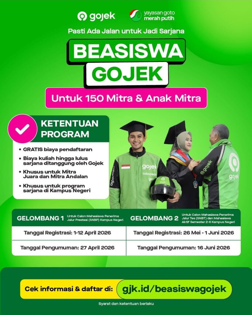 Pendidikan adalah kunci masa depan, dan Gojek melalui komitmen berkelanjutannya kembali menghadirkan Beasiswa Gojek. Program ini merupakan bagian dari program Gojek Swadaya yang bertujuan untuk meningkatkan taraf hidup keluarga mitra melalui akses pendidikan tinggi berkualitas di Perguruan Tinggi Negeri (PTN) unggulan.