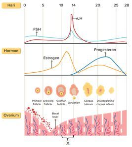 hormon yang disekresikan hipofisis anterior, lonjakan (peak) yang sangat tajam pada kurva LH (Luteinizing Hormone) pada pertengahan siklus (sekitar hari ke-14) merupakan pemicu utama terjadinya peristiwa ovulasi.